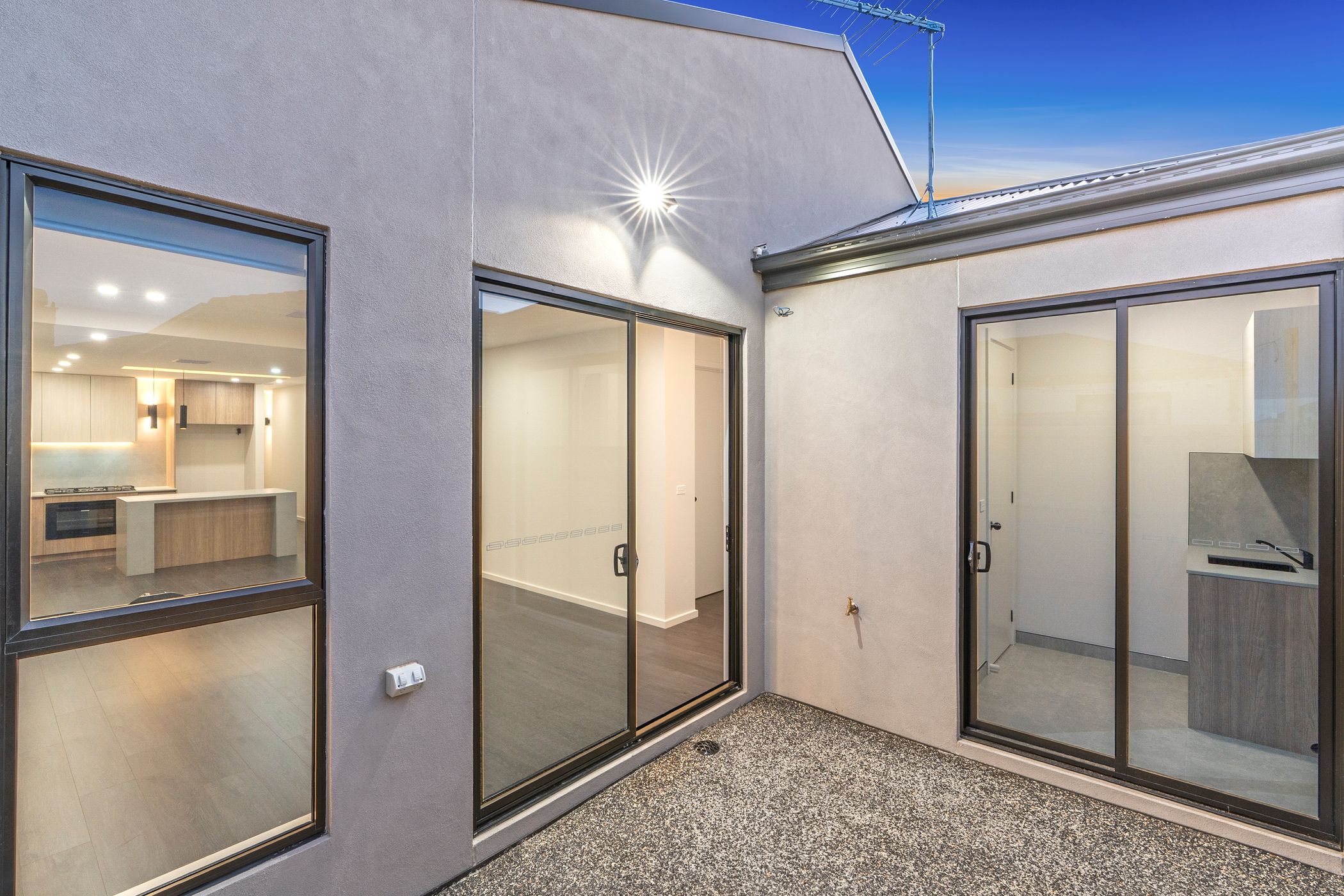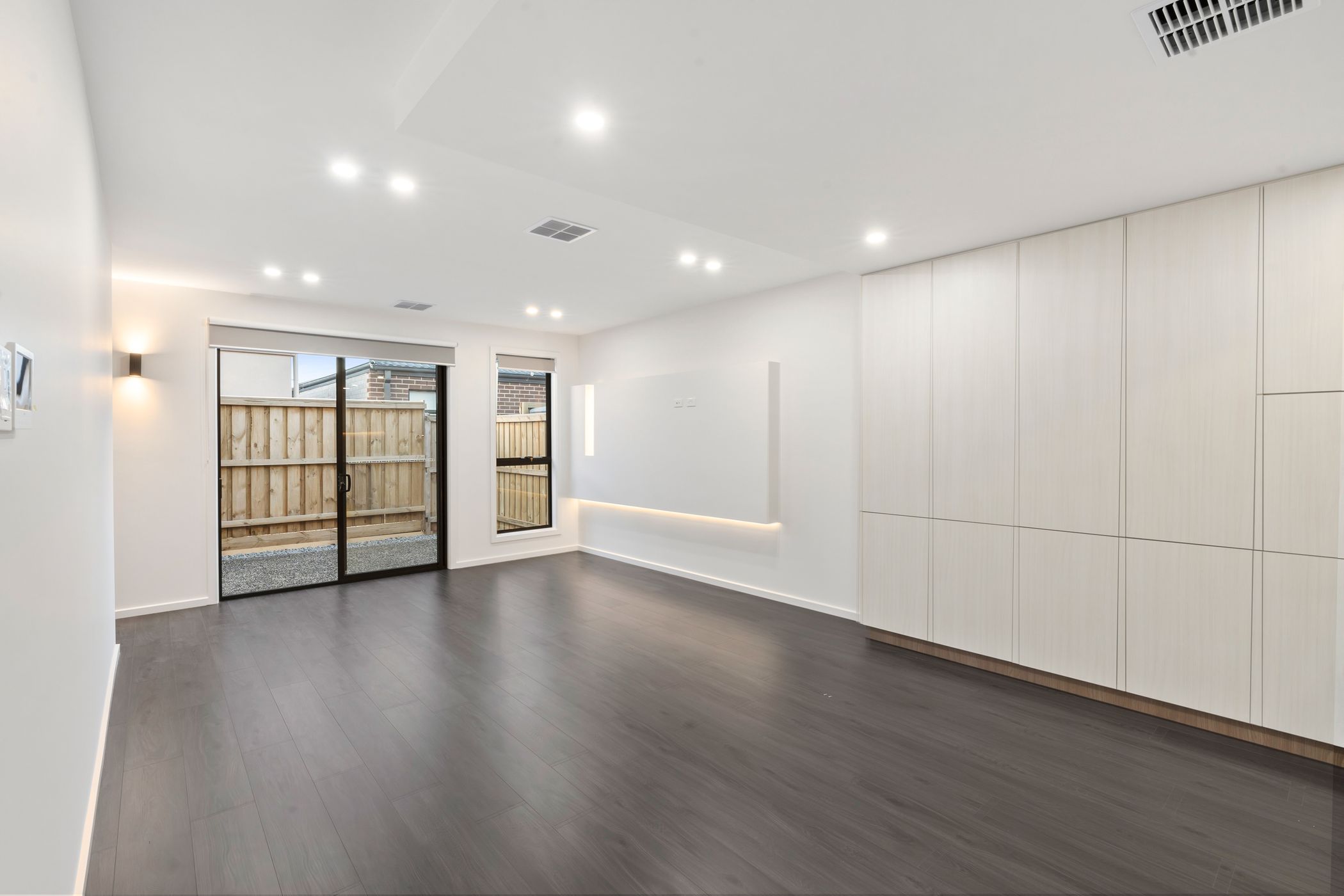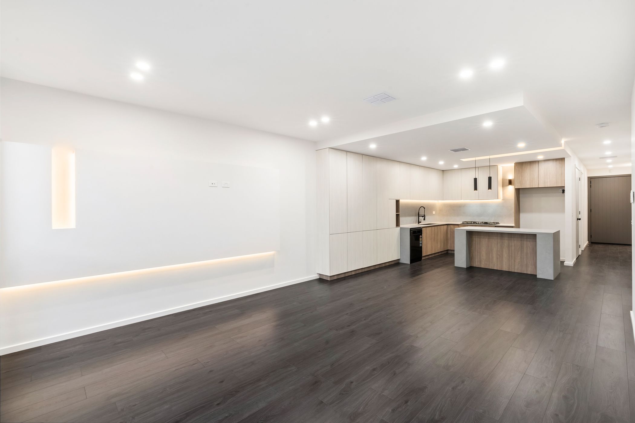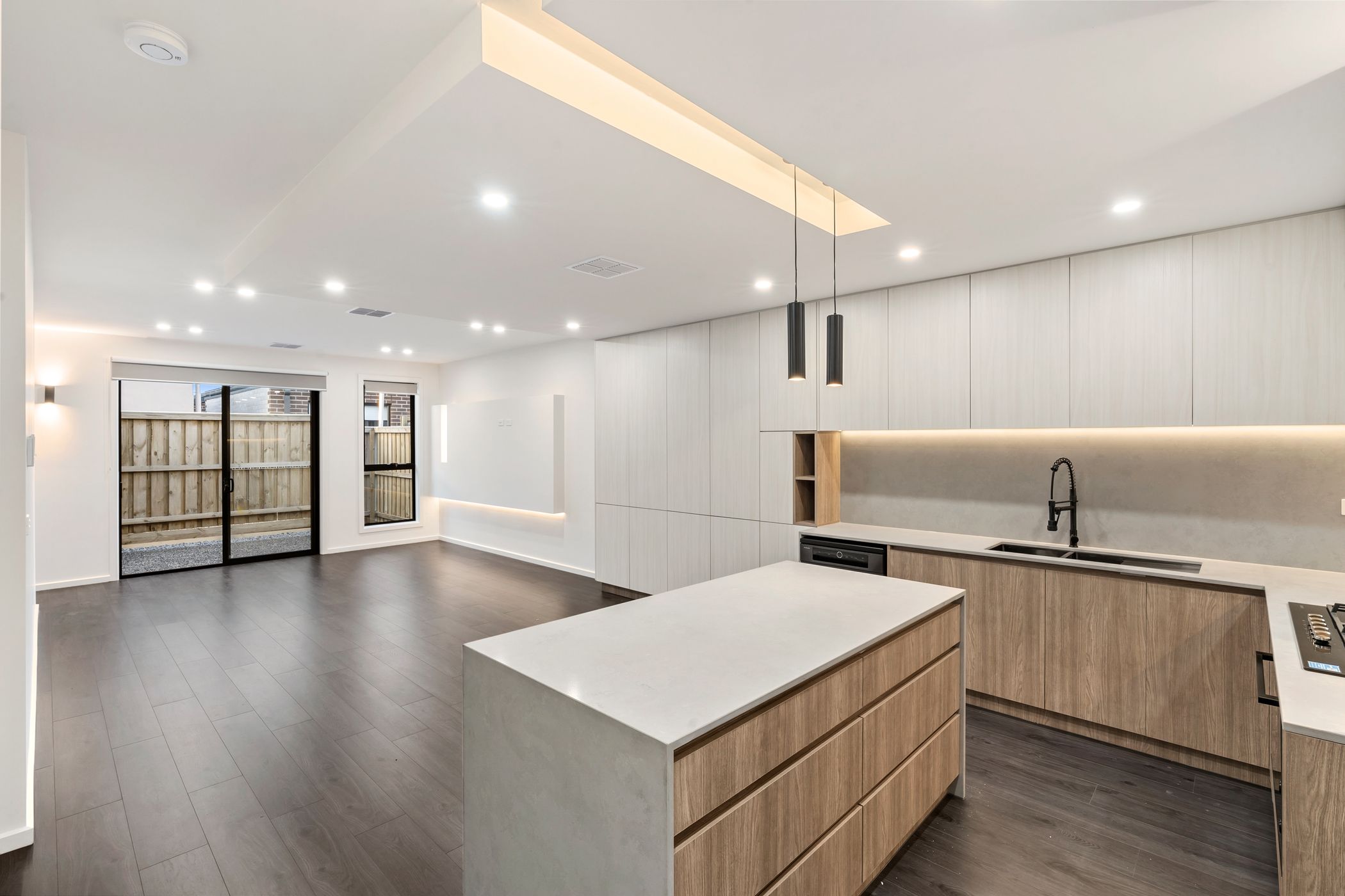 Enjoy open plan living with stylish wooden tiling, ambient lighting, and plenty of natural sunlight through large windows and sliding doors.