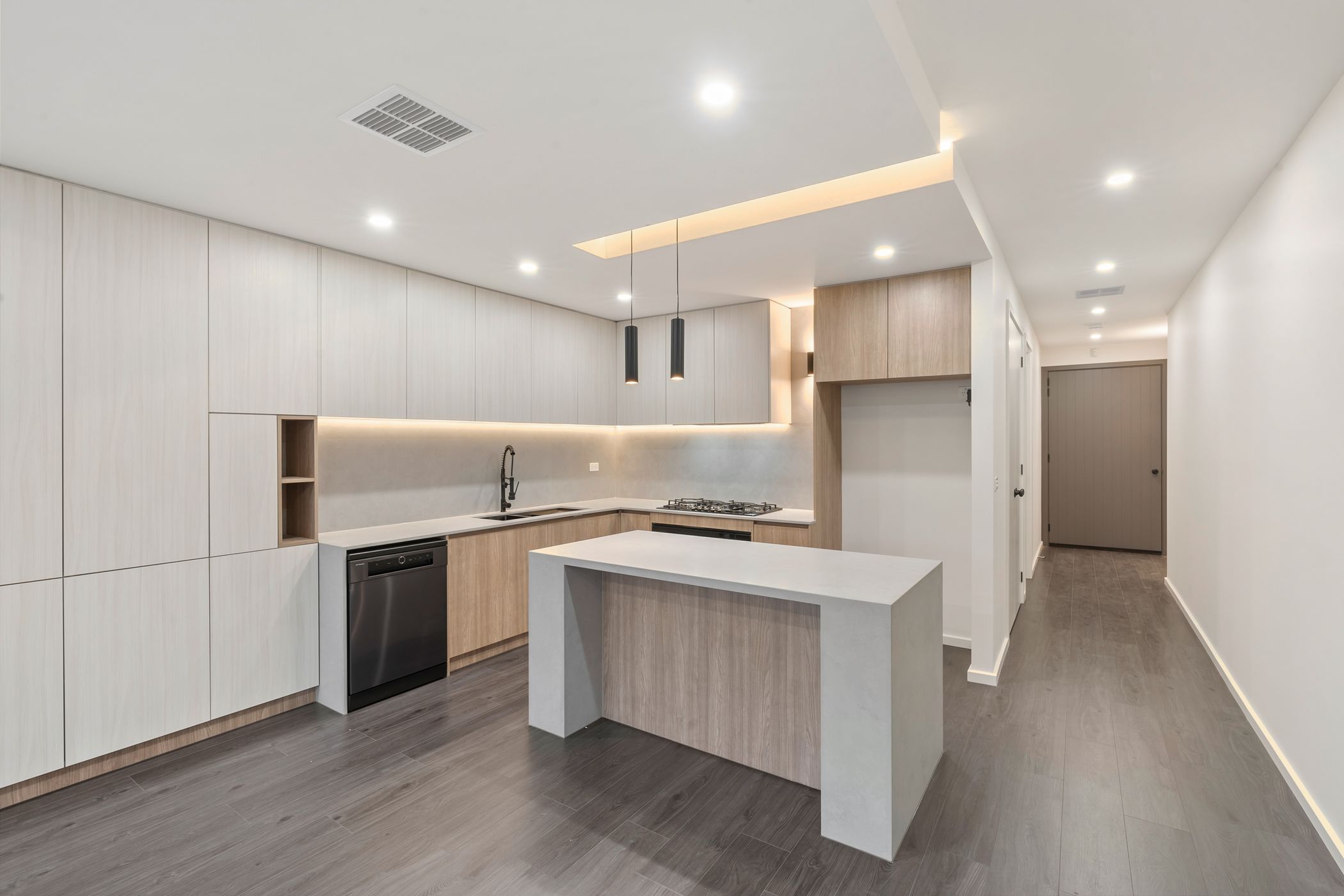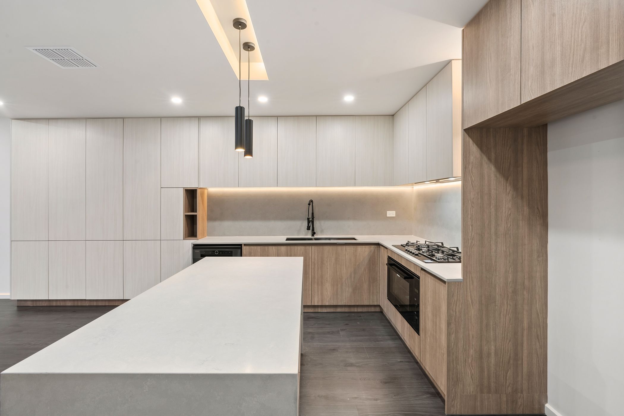 The heart of the home boasts a state-of-the-art kitchen with premium cabinetry, stone benchtops, LED feature lighting, a large island bench, quality appliances, and a sleek gas cooktop-perfect for family meals and entertaining.