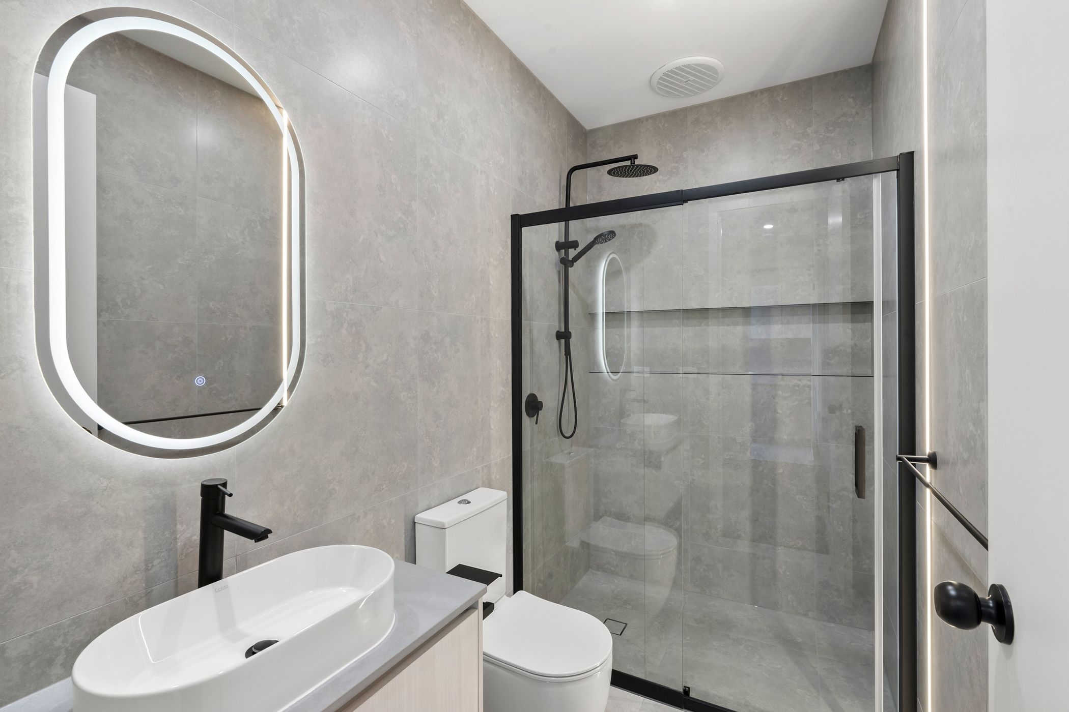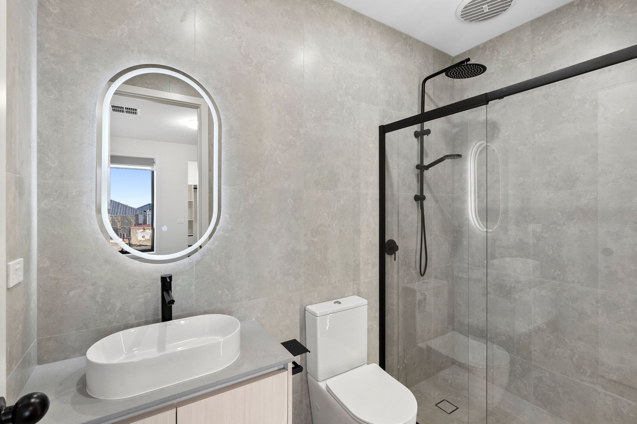 Two well-designed bathrooms with black matte fittings, and frameless showers offer a spa-like experience.